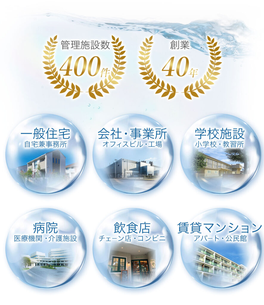 ご家庭から会社、学校、病院、ホテル、老人ホーム、賃貸マンション、ファミリーレストラン、スーパー、農業集落排水施設など様々な施設の浄化槽の維持管理をはじめ、浄化槽メンテナンス(修理・工事)、除害施設の維持管理、排水管清掃などの水に関わる業務が主な事業内容です。